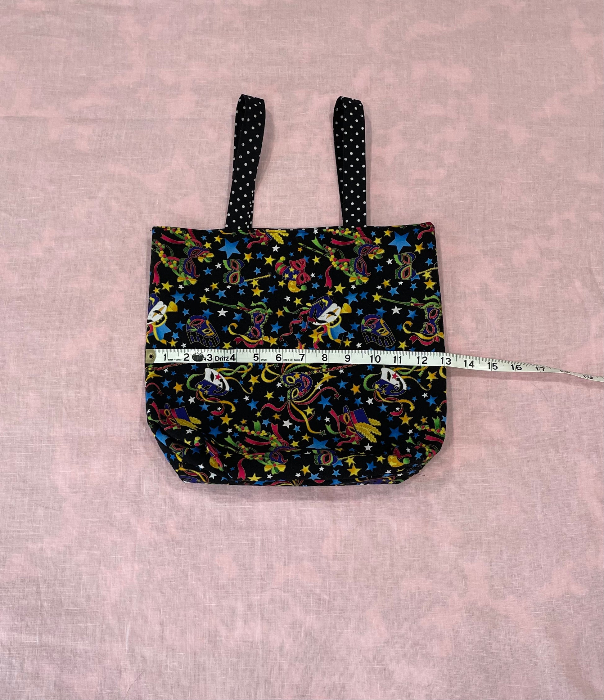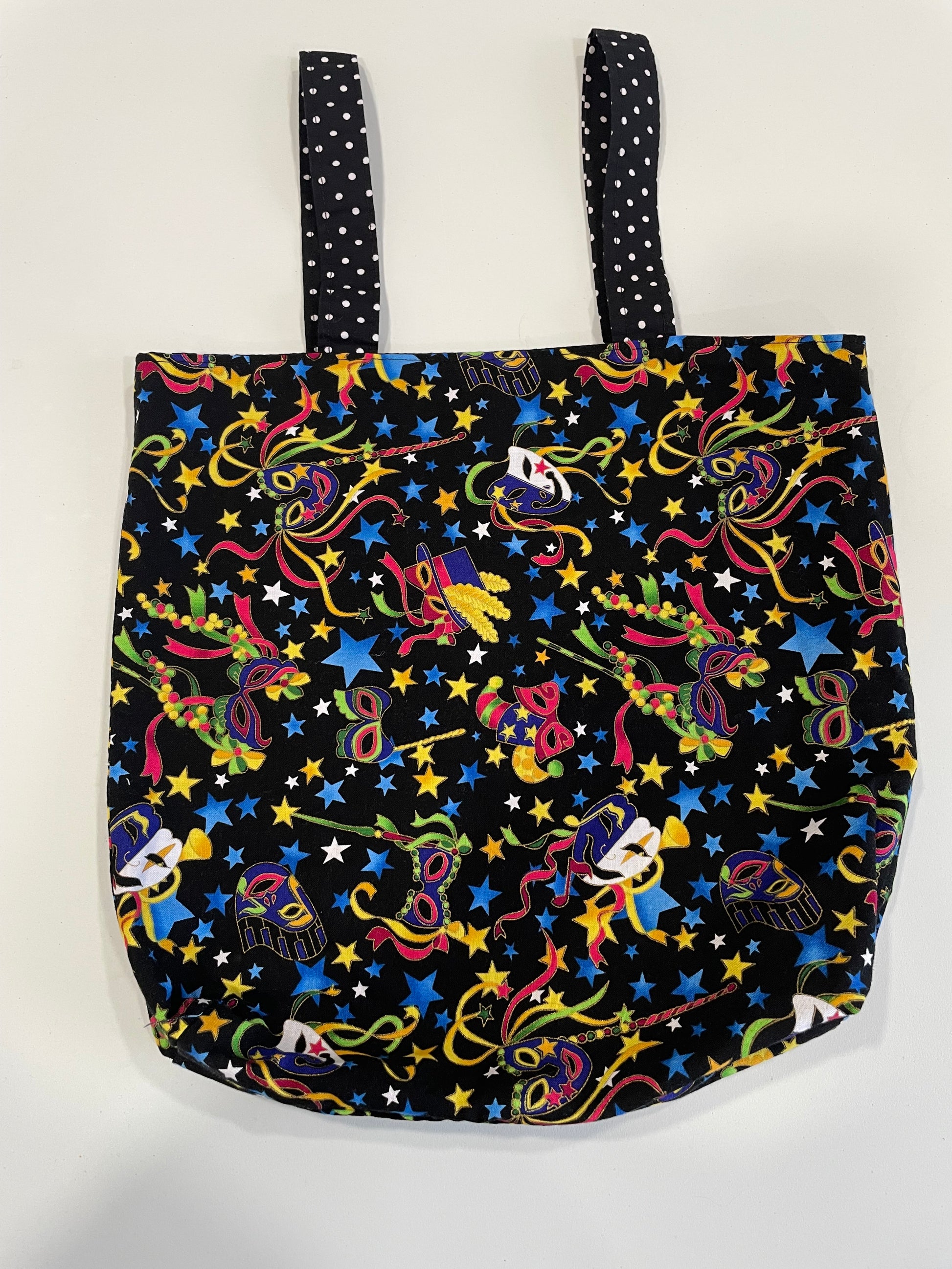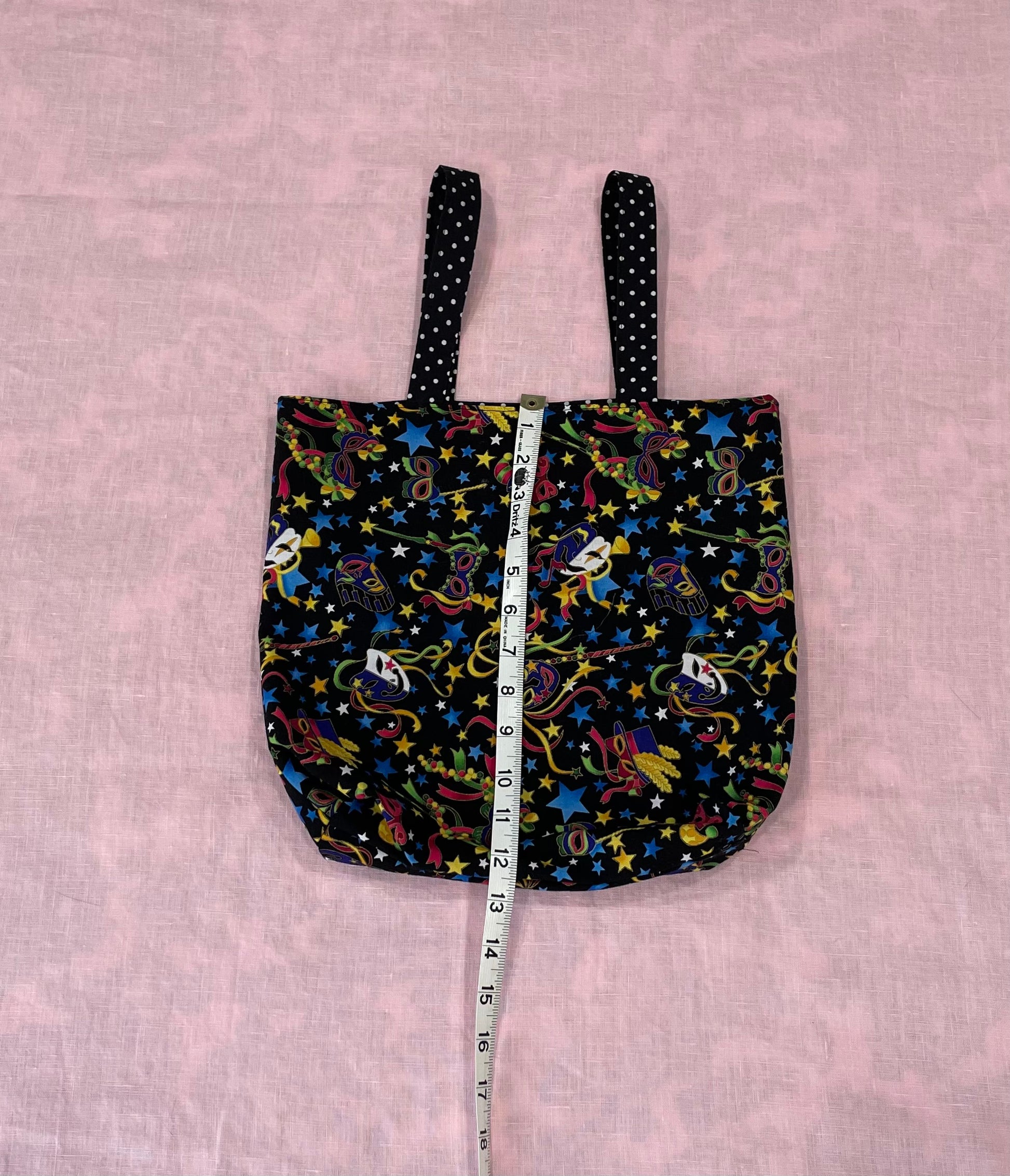 This meticulously crafted 12 x 12" cotton cloth tote features an eye-catching whimsical black mask print exterior, complemented by a sophisticated black-and-white polkadot fabric lining. The contrasting interior adds structural integrity while enhancing visual appeal. Designed with precision, this versatile accessory offers both practical functionality and distinctive style for everyday use.