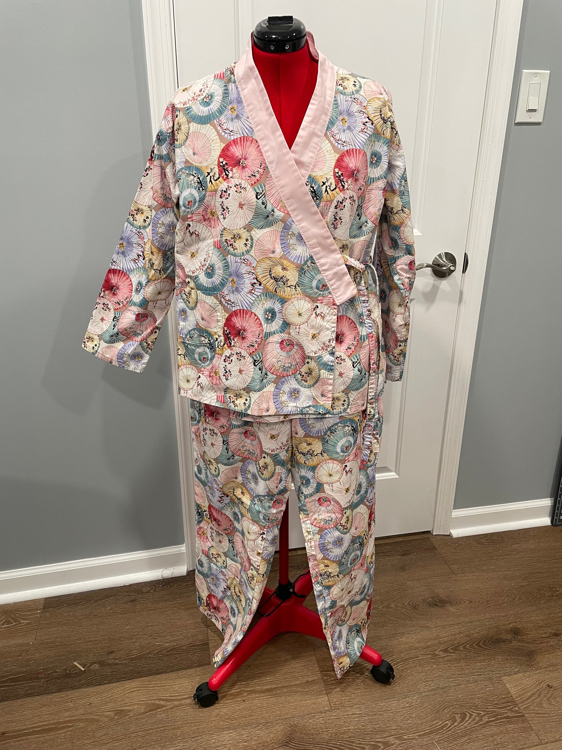 Elevate your nighttime routine with these sophisticated Asian-style pajamas featuring a distinctive pink umbrella print enhanced with metallic accents. Crafted from premium cotton fabric for breathability and comfort, this set includes elastic waist bottoms for a secure fit. Available in Size 12/US Large and machine washable for convenient care, these pajamas combine practical functionality with elegant design.